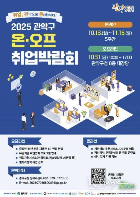 오프라인 채용관은 오는 10월 31일 관악구청 8층 대강당에서 10시부터 17시까지 진행된다. 현장 면접이 가능한 ‘채용관’ 외에도 ▲유관기관 취업지원 프로그램 안내 ▲인공지능(AI) 면접 ▲취업타로 상담 ▲퍼스널컬러 진단 ▲이력서 사진촬영 등 다양한 부대행사도 마련된다.