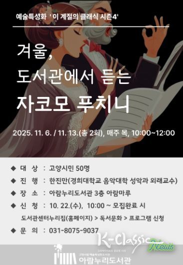 K-Classic News 기자 | 고양특례시 아람누리도서관은 오는 11월 6일, 13일 오전 10시부터 12시까지 예술특성화 프로그램 ‘겨울, 도서관에서 듣는 자코모 푸치니’를 운영한다.