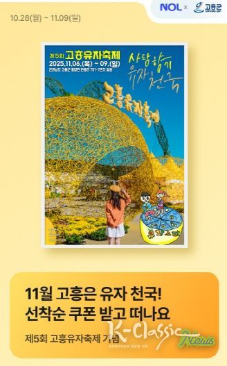 K-Classic News 기자 | 고흥군이 오는 11월 6일부터 9일까지 열리는 ‘제5회 고흥유자축제’를 맞아, 축제 방문객과 가을 여행객을 위해 숙박할인 프로모션 이벤트를 진행한다.