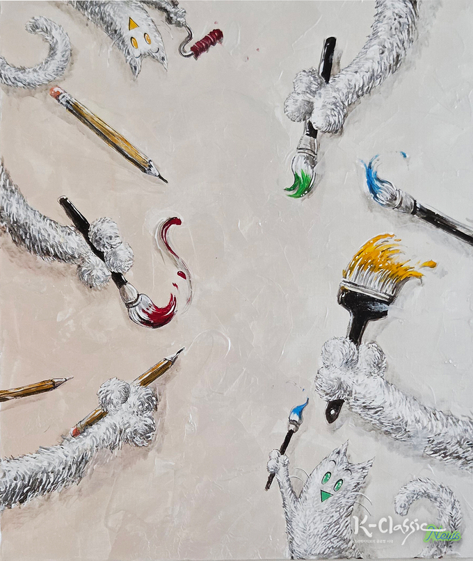 PartyCAT의 캔버스 속 고양이는 때로는 인간의 감정을 비추는 거울이자, 때로는 현실 너머 이상향을 자유롭게 유영하는 존재로 등장한다.