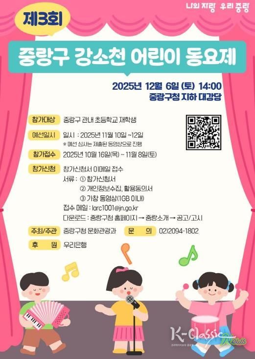 K-Classic News 기자 | 중랑구는 12월 6일 오후 2시, 중랑구청 지하대강당에서 ‘제3회 중랑구 강소천 어린이 동요제’를 개최한다.