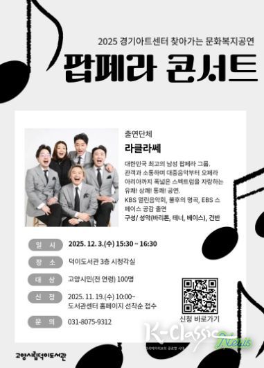 K-Classic News 기자 | 고양특례시 덕이도서관은 오는 12월 3일(수) 오후 3시 30분, 경기아트센터의 찾아가는 문화복지공연 지원사업으로 ‘팝페라 콘서트’를 운영한다.