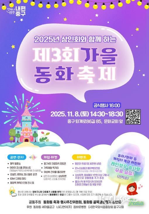 K-Classic News 기자 | 서울 중구 동화동 문화교회(퇴계로86길 85) 일대가 오는 11월 8일 오후 2시 30분부터 6시 30분까지 ‘제3회 상인회와 함께하는 가을동화축제’로 들썩인다.