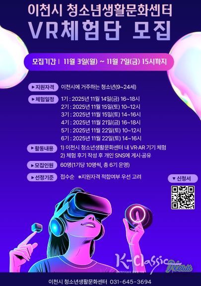 K-Classic News 기자 | 지난 10월 30일 개관한 이천시 청소년생활문화센터는 첫번째 프로그램으로 첨단기술 체험의 기회를 제공하고 시설 운영 개선에 대한 적극적인 의견을 청취하고자 ‘이천시 청소년생활문화센터 가상현실(VR) 체험단’을 모집한다고 밝혔다.