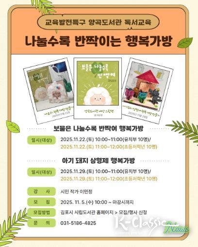 K-Classic News 기자 | 김포시 양곡도서관이 오는 11월 22일부터 29일까지 시민작가와 함께하는 독서교육 프로그램 '나눌수록 반짝이는 행복가방'을 운영한다.