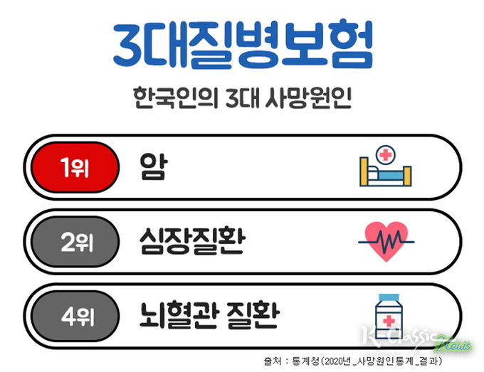 K-Classic News 기자 | 3대질병으로 일컬어지는 암, 뇌혈관질환, 심혈관질환은 한국인의 주요 사망원인에서 상위를 차지하고 있으며, 이에 대한 진단비를 집중적으로 보장해 주는 보험상품을 3대질병진단비 보험이라 할 수 있다.