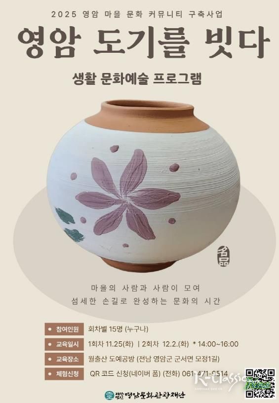 K-Classic News 기자 | (재)영암문화관광재단은 오는 11월 25일 오후 2시부터 4시까지, 영암군 군서면 모정마을에 위치한 월출산도예공방(대표 정수미)에서 지역민과 함께하는 생활문화 예술 프로그램인‘영암 도기를 빗다’를 개최한다.