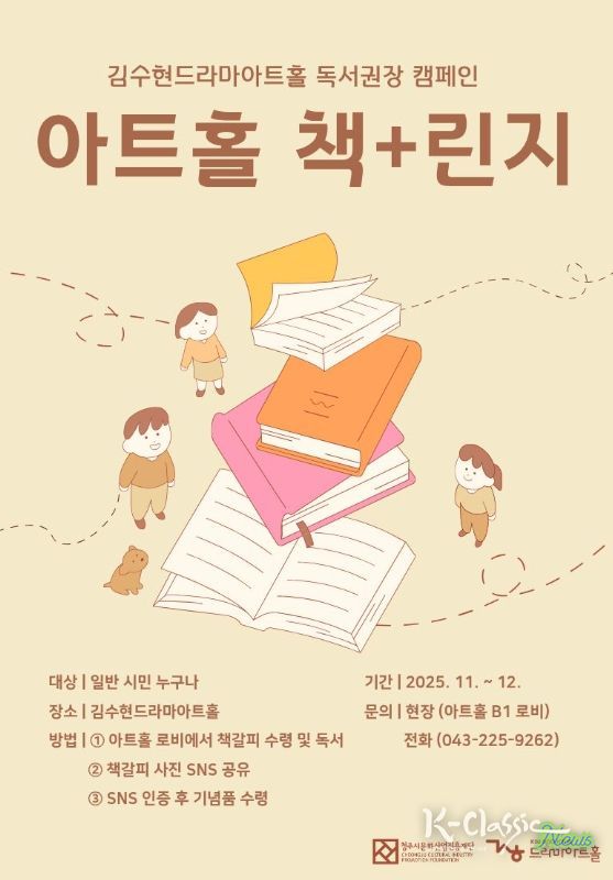 청주시문화산업진흥재단(대표이사 변광섭)이 운영하는 국내 유일 드라마문학관 김수현드라마아트홀(이하 드라마아트홀)은 올해 말까지 독서 도전 캠페인 ‘책+린지’를 진행한다고 19일 밝혔다.