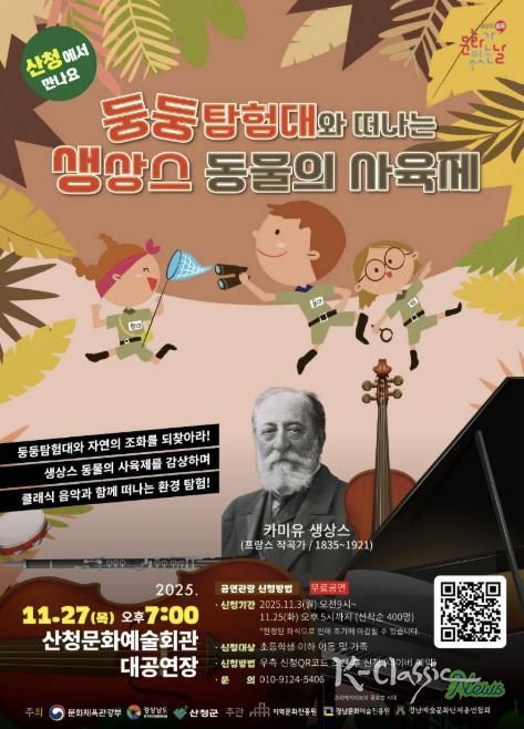 K-Classic News 기자 | 산청군은 오는 27일 문화예술회관 대공연장에서 ‘둥둥탐험대와 함께하는 생상스 동물의 사육제’ 공연을 개최한다고 20일 밝혔다.