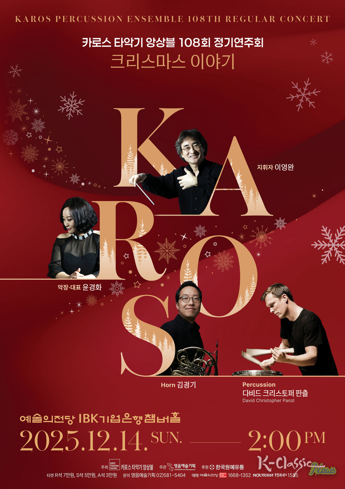 국내를 대표하는 카로스 타악기 앙상블이 오는 12월 14일 제108회 정기연주회 크리스마스 이야기를 통해 한 해를 마무리하는 특별한 무대를 선보인다. 이번 공연은 호른 연주자 김정기와 타악기 연주자 다비드 크리스토퍼 판츨(David Christopher Panzl)의 협연과 함께, 고전에서 현대에 이르는 폭넓은 프로그램으로 구성되어 있다.