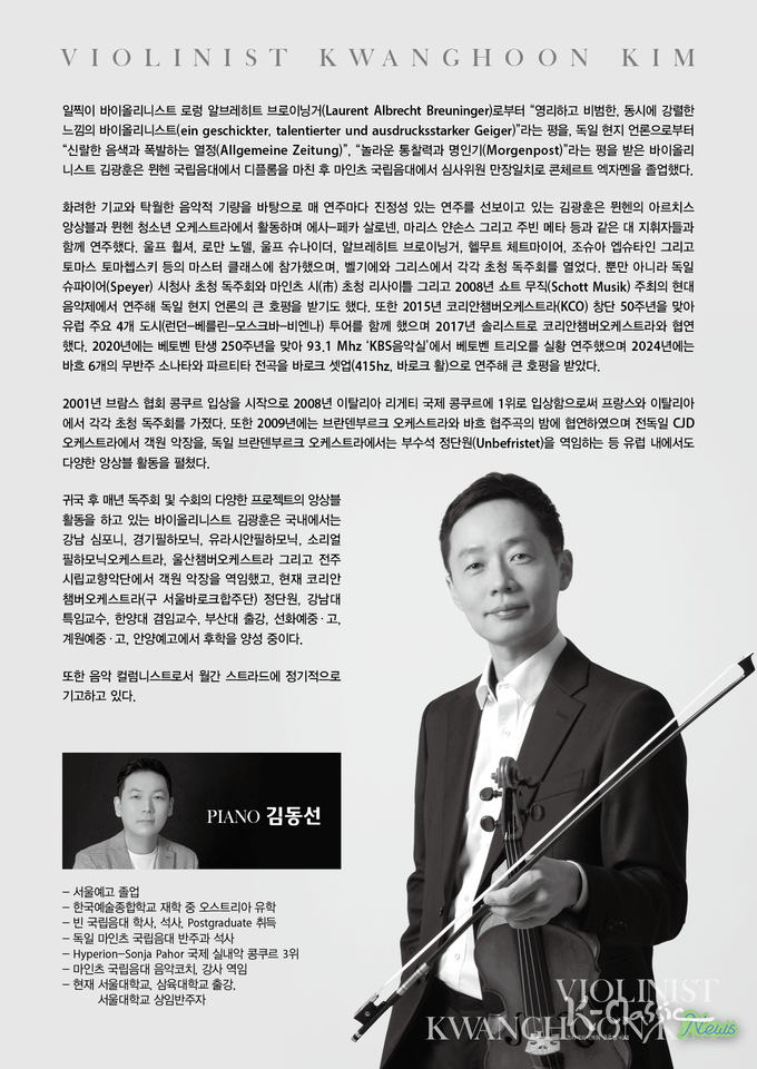 화려한 기교와 탁월한 음악적 기량을 바탕으로 매 연주마다 진정성 있는 연주를 선보이고 있는 바이올리니스트 김광훈의 독주회가 오는 11월 30일 금호아트홀 연세에서 개최된다. 바이올리니스트 김광훈은 로렁 알브레히트 브로이닝거(Laurent Albrecht Breuninger)로부터 “영리하고 비범한, 동시에 강렬한 느낌의 바이올리니스트(ein geschickter, talentierter und ausdrucksstarker Geiger)”라는 평을 받았으며, 독일 현지 언론으로부터 “신랄한 음색과 폭발하는 열정(Allgemeine Zeitung)”, “놀라운 통찰력과 명인기(Morgenpost)”라는 평을 받은 실력있는 연주자로 뮌헨 국립음대에서 디플롬 을 마친 후 마인츠 국립음대에서 심사위원 만장일치로 콘체르트 엑자멘을 졸업했다.