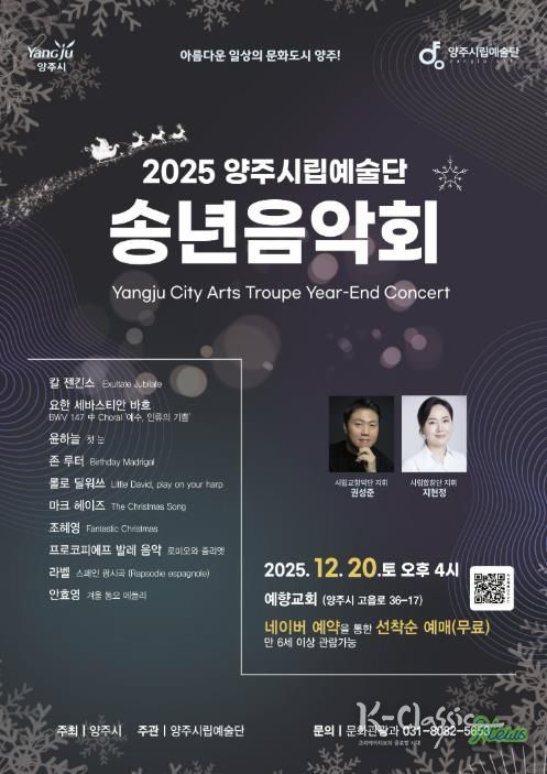 K-Classic News 기자 | 양주시가 오는 12월 20일 오후 4시, 예향교회(고읍로 36-17)에서 ‘2025 양주시립예술단 송년음악회’를 개최한다.