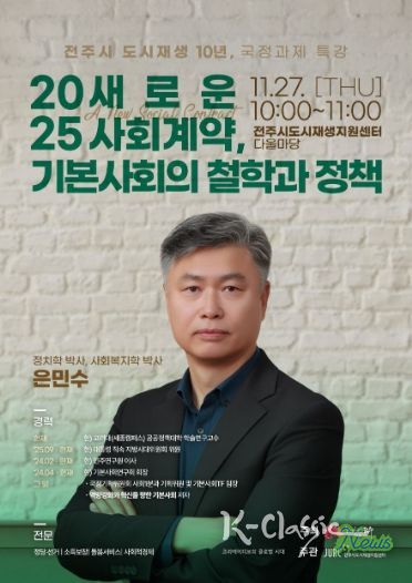 K-Classic News 기자 | 현 정부의 국정 방향인 기본사회를 주제로 도시의 사회제도와 정책 방향이 나아갈 모색하는 특별한 강연이 전주에서 열린다.