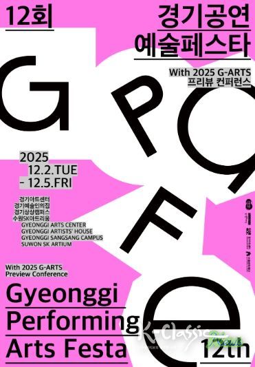 K-Classic News 기자 | 경기문화재단은 경기도 수원 일대에서 제12회 경기공연예술페스타를 개최한다. 페스타는 2025년 12월 2일부터 5일까지 경기 예술인의 집, 경기아트센터, 경기상상캠퍼스, 수원SK아트리움 등에서 진행되며, 베스트콜렉션, 쇼케이스 데이, 공동 창·제작 쇼케이스, 피치세션, 토크세션, 워크숍 등 다양한 프로그램을 통해 경기 공연예술 생태계의 흐름과 성과를 한눈에 보여줄 예정이다. 또한 경기아트센터 주최 ‘2025 G-ARTS 프리뷰 컨퍼런스’가 동시 개최되며, 보다 풍성한 전문 교류의 장을 마련한다.
