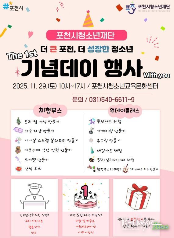 K-Classic News 기자 | 포천시청소년재단은 재단 출범 1주년을 맞아 오는 29일 포천시청소년교육문화센터에서 ‘2025년 포천시청소년재단 1주년 기념행사 – 더 큰 포천, 더 성장한 청소년’을 개최한다.
