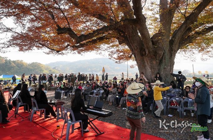 추수를 마친 들판에 우뚝 서 있는 800년 넘는 보호수 느티나무 아래서 펼쳐진 이 음악회에는 마을주민과 관광객 등 400여 명이 함께 해 늦가을의 정취에 흠뻑 빠졌다.