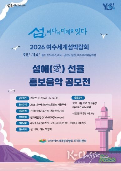 K-Classic News 기자 | (재)2026여수세계섬박람회조직위원회가 12월 14일까지 ‘2026여수세계섬박람회 섬애(愛)선율 음악 공모전’을 개최한다.