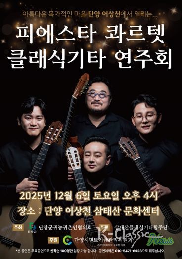 이번 연주회는 단양군귀농귀촌인협의회가 주최하고 단양시멘트기금관리위원회가 후원하며, 어상천에서 활동하는 삼태산 클래식기타 합주단이 주관한다. 귀농귀촌인협의회 박영자 회장은 “이번 공연이 단양의 문화예술 발전에 기여하고, 원주민과 귀농·귀촌인이 함께 어우러지는 화합의 장이 되길 바란다”며 “아름다운 클래식기타 선율을 통해 서로의 마음을 나누는 소중한 시간이 될 것이라 확신한다”고 소감을 전했다.