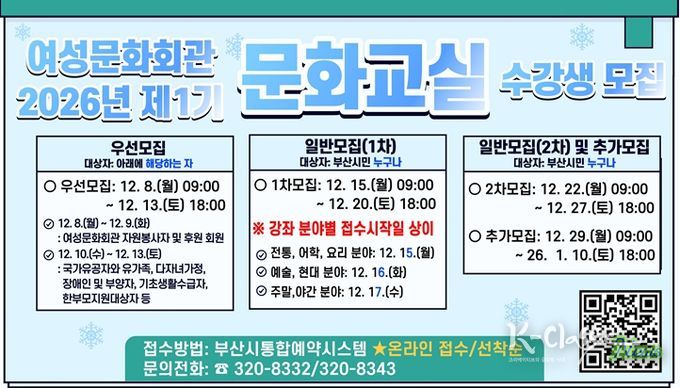 K-Classic News 기자 | 부산시 여성문화회관은 오는 내일(8일)부터 '2026년 제1기 문화교실' 수강생을 모집한다고 밝혔다.
