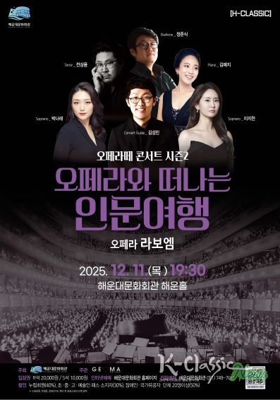 K-Classic News 기자 | 해운대문화회관(관장 이서윤)은 오는 12월 11일 오후 7시 30분, 오페라떼 콘서트 시즌2‘오페라와 떠나는 인문 여행 ’라보엠’을 해운대문화회관 해운홀에서 개최한다.