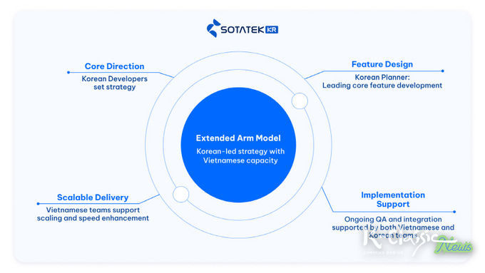 전통적으로 명확한 문서와 고정된 요구사항을 우선하는 방식과 달리, SotaTek Korea는 "Korean Hybrid Delivery" 모델을 구축했다. 이 모델에서 한국인 개발자·기획자·디자이너가 지속적으로 변경되는 요구사항과 고객과의 직접 커뮤니케이션이 필요한 핵심 업무를 담당한다. 반면, 베트남 개발자는 보다 안정적인 영역을 중심으로 ‘extended arm’ 역할을 수행하며 한국 팀의 역량을 확장하는 데 기여한다.
