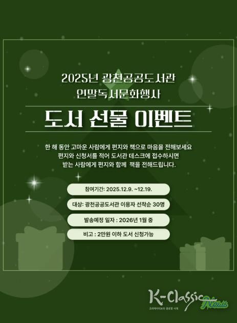 군에 따르면 오는 19일까지 3층 종합자료실에서 이용자 30명을 선착순으로 도서 선물 이벤트를 접수한다. 한 해 동안 고마운 사람을 생각하며 편지와 함께 책 선물로 마음을 전하는 행사이며 도서관에서 제공되는 편지지와 신청서를 작성하여 데스크에서 접수할 수 있다. 2만원 한도 내에서 원하는 도서를 선물 가능하며, 도서비와 배송료는 도서관에서 부담한다.