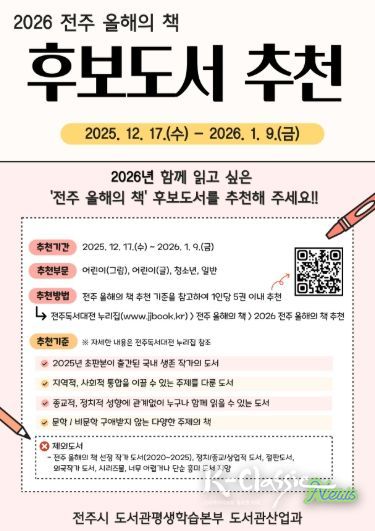박남미 전주시 도서관평생학습본부장은 “전주 올해의 책은 누군가가 정해주는 것이 아니라, 시민의 마음에서 시작되는 책”이라면서 “한 권의 책을 추천하는 작은 참여가 전주의 독서 풍경을 바꾸는 소중한 계기가 되길 바란다”고 말했다.