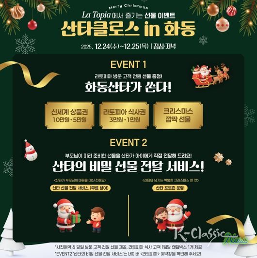 ‘화동 산타가 쏜다’는 라토피아 식사 고객 전원에게 랜덤 박스를 증정하는 깜짝 이벤트다. 무엇이 나올지 모르는 설렘이 크리스마스의 재미를 더한다. 아이들을 위한 특별한 순간도 마련됐다. 부모가 미리 준비한 선물을 산타가 직접 전달하는 산타의 비밀 선물 전달 이벤트다. 산타를 만난 아이들의 웃음이 공간을 가득 채울 예정이다.