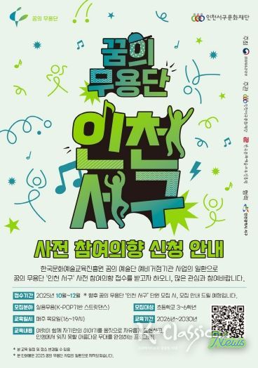 한편, 인천서구문화재단은 향후 ‘꿈의 무용단 인천 서구’ 사업 참여를 희망하는 예비 단원의 수요 파악을 위해 오는 12월 31일까지 사전 참여의향 접수를 진행한다. 참여 방법 등 자세한 사항은 인천서구문화재단 홈페이지에서 확인할 수 있다.