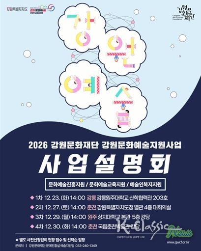 K-Classic News 기자 | 강원문화재단은 2026년 강원문화예술지원사업의 주요 내용과 변경 사항을 도내 예술인에게 종합적으로 안내하기 위해 ‘2026년 강원문화예술지원사업 통합 설명회’를 개최한다고 밝혔다.