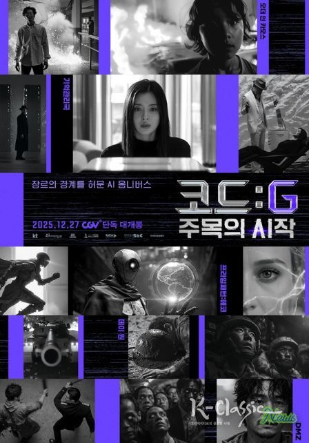 새로운 영화 세대의 탄생을 알리는 생성형 AI 유니버스 영화 '코드: G 주목의 시작' 은 생성형 AI 기술을 영화 제작 전반에 적극적으로 활용해 완성한 프로젝트로, 다섯 명의 감독이 각기 다른 장르와 세계관을 통해 인간과 기술, 기억과 전쟁, 질서와 혼돈이라는 동시대적 질문을 던지는 옴니버스 영화다.