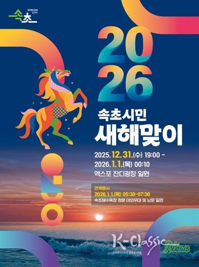 K-Classic News 기자 | 속초시가 병오년 ‘붉은 말의 해’를 맞아 12월 31일(수) 저녁 7시부터 엑스포 잔디광장 일원에서 ‘2026 속초시민 새해맞이 행사’를 개최한다. 다채로운 프로그램이 이어지며 시민의 안녕과 희망찬 새해 출발을 기원하는 화합의 시간이 될 전망이다.
