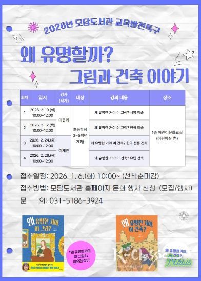 K-Classic News 기자 | 김포시 모담도서관은 어린이를 대상으로 한 문화·예술 융합 프로그램 '왜 유명할까 그림과 건축 이야기'를 2월 10일부터 26일까지 매주 화·목요일 오전 10시부터 12시까지 1층 어린이 문화교실에서 운영한다.