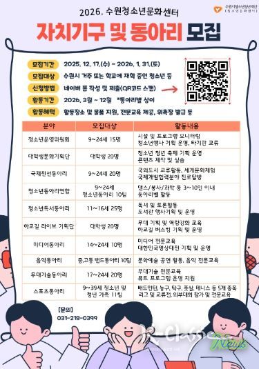 K-Classic News 기자 | 수원시청소년청년재단 수원청소년문화센터는 청소년의 자치 역량 강화와 문화 활동 참여 확대를 위해 '2026년 수원청소년문화센터 자치기구 및 동아리' 단원을 모집한다.