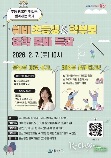 K-Classic News 기자 | 서울 용산구는 오는 2월 7일 용산아트홀(녹사평대로 150)에서 예비 초등학생과 학부모를 위한 입학 준비 행사인 ‘초등 행복한 첫걸음, 함께하는 축제’를 개최한다.