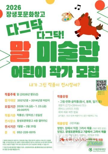 K-Classic News 기자 | 고래문화재단에서 관리하는 장생포문화창고는 2026년 병오년 ‘붉은 말의 해’를 맞아 어린이가 직접 전시의 주체가 되는 참여형 미술 전시 ‘다그닥 다그닥! 말 미술관 – 아이들 상상 속 말 친구들-’을 오는 1월 24일부터 2월 25일까지 장생포문화창고 4층 전관에서 개최한다.