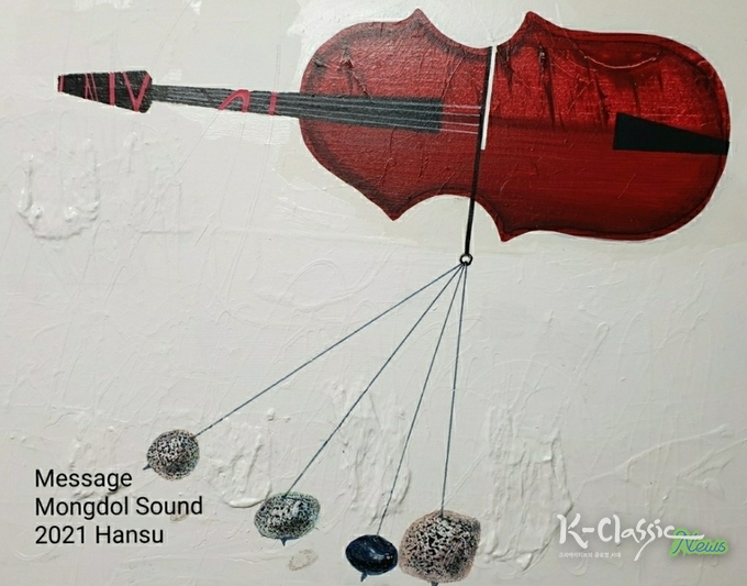 <몽돌소리> 는 소리의 기원과 감각의 기억을 시각적으로 번역한 작품이다. 붉은 몸체는 악기의 물성을 넘어 감정과 생명의 중심부처럼 제시되며, 그 아래로 매달린 몽돌들은 보이지 않는 소리를 기다리는 침묵의 매개체로 작동한다. 줄에 의해 연결된 몽돌은 단순한 자연물이 아니라, 시간과 파동, 그리고 반복된 접촉 속에서 축적된 기억의 결정체이다.
