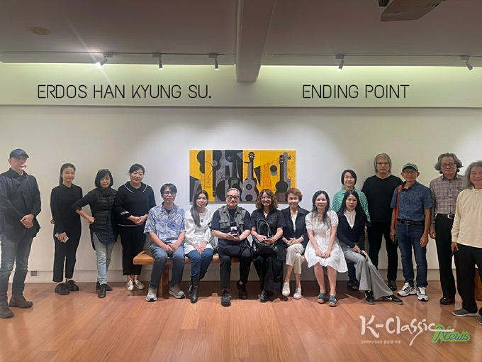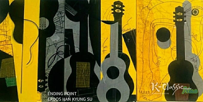 <ENDING POINT>는 기타라는 악기의 형상을 반복적으로 배치하면서, 소리의 도달점이자 존재의 종착점을 사유하게 하는 작품이다. 화면을 분할하는 수직 구조는 시간의 흐름 혹은 서사의 단계처럼 읽히 각 패널은 하나의 장면이자 하나의 기억 단위로 기능한다.