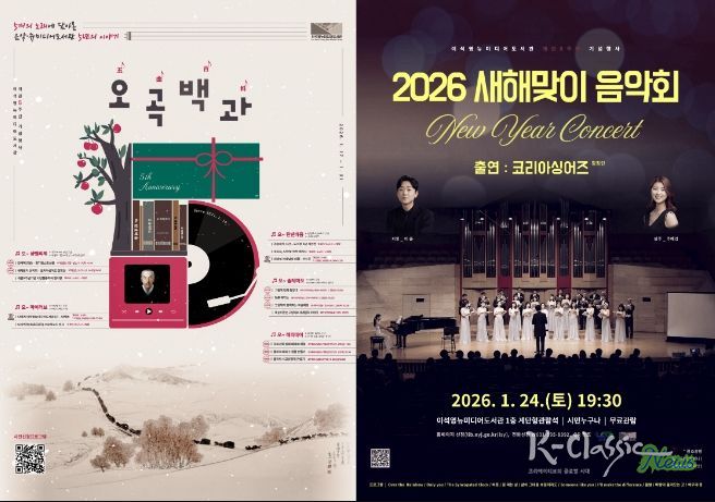 대표 프로그램으로는 오는 24일 오후 7시 30분, 도서관 1층 계단형 관람석에서 열리는 ‘2026 새해맞이 음악회’가 있다. 음악회에는 코리아싱어즈 합창단, 오카리나 연주자 김욱, 클라리네티스트 김예원 등이 출연해 새해의 희망을 전하는 공연을 선보인다.
