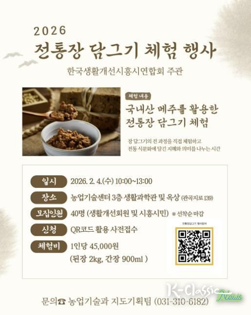 K-Classic News 기자 | 시흥시 여성농업인 단체 한국생활개선시흥시연합회는 우리 고유의 전통 발효식품 문화를 계승ㆍ확산하기 위해 시민과 함께하는 ‘전통 장 담그기 체험행사’를 오는 2월 4일 시흥시농업기술센터에서 연다.