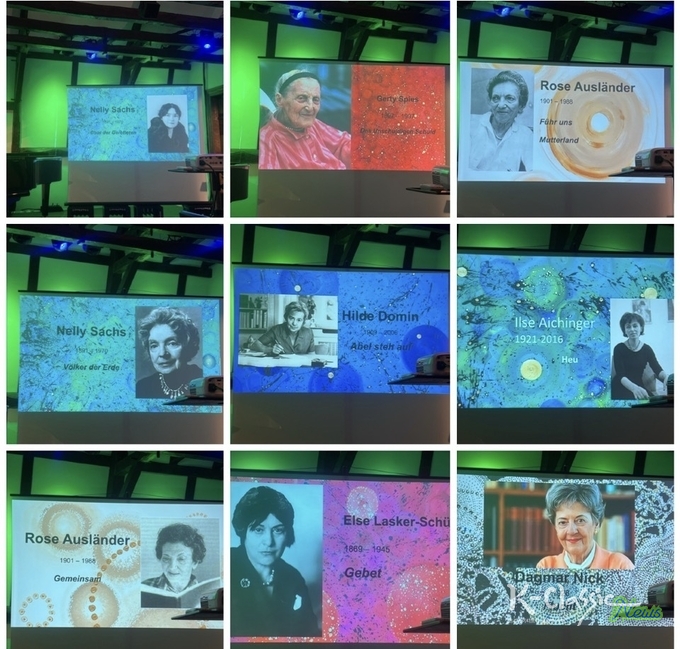 Nelly Sachs (1891–1970), Gerty Spies (1897–1997), Rose Ausländer (1901–1988), Hilde Domin (1909–2006), Ilse Aichinger (1921–2016), Else Lasker-Schüler (1869–1945), Dagmar Nick (1926–), Gertrud Kolmar (1894–1943), Mascha Kaléko (1907–1975), Selma Meerbaum-Eisinger (1924–1942), Hannah Arendt (1906–1975).