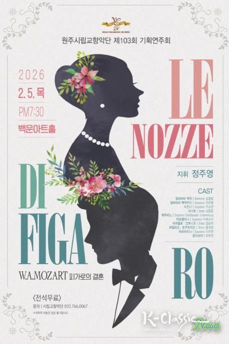 K-Classic News 기자 | 원주시립교향악단은 오는 2월 5일 오후 7시 30분 백운아트홀에서 제103회 기획연주회 ‘피가로의 결혼’을 개최한다.