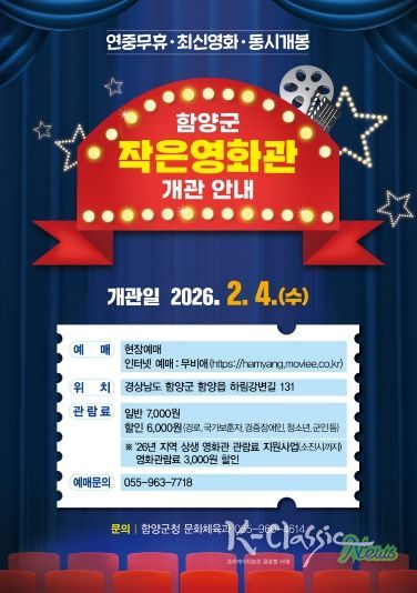 K-Classic News 기자 | 함양군은 군민 누구나 가까이에서 영화를 즐길 수 있는 ‘함양군 작은영화관’을 오는 2월 4일 개관하고 본격적인 운영에 들어간다고 밝혔다.