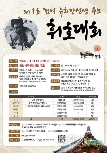 K-Classic News 기자 | 인천서구문화재단은 오는 2월 2일부터 2월 27일까지 ‘제1회 검여 유희강 선생 추모 휘호대회’ 참가자를 모집한다.