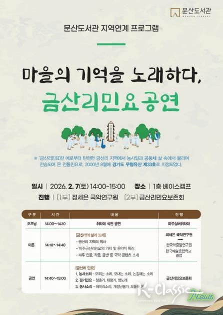 K-Classic News 기자 | 파주시 문산도서관은 오는 7일 경기도 무형유산 제33호 ‘파주금산리민요’를 주제로 강연과 공연이 함께하는 ‘렉처 콘서트’를 개최한다.