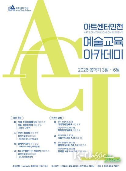 K-Classic News 기자 | 인천경제자유구역청은 오는 3월부터 ‘예술교육 아카데미 봄학기 정규강좌’를 시작한다고 밝혔다.