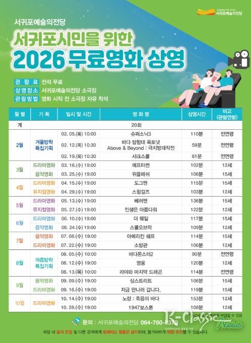 K-Classic News 기자 | 서귀포예술의전당은 시민들에게 다양한 영화 관람 기회를 제공하고 문화 접근성을 확대하기 위해 2월 5일부터 10월 28일까지 서귀포예술의전당 소극장에서 무료영화 상영 사업을 운영한다.
