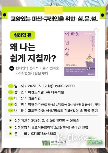 K-Classic News 기자 | 김포시 마산도서관은 심리적 피로와 번아웃을 주제로 한 인문교양 강연 '왜 나는 쉽게 지칠까?'를 오는 3월 12일 오후 7시부터 9시까지 마산도서관 3층 다목적실에서 운영한다.