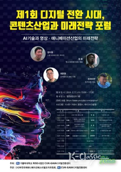 K-Classic News 기자 | 제28회 부천국제애니메이션페스티벌은 가톨릭대학교 RISE사업단 CUK-GAIA디지털전환센터가 주최하고, BIAF와 CUK-GAIA디지털전환센터가 공동 주관하는 『디지털전환시대, 콘텐츠산업과 미래전략』 포럼을 오는 2월 11일 개최한다.