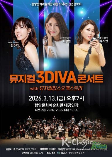 K-Classic News 기자 | 함양문화예술회관은 오는 3월 13일 오후 7시 신년 음악회 ‘뮤지컬 3DIVA’ 콘서트를 개최한다.